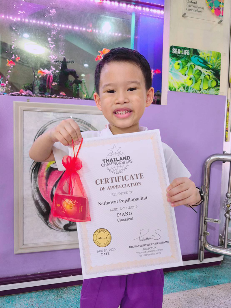 |   ป.1 รางวัลชนะเลิศระดับภาคอีสาน  นักเรียนG.1 โรงเรียนนานาชาติเมทนีดล    คุณธามคว้าโล่รางวัลชนะเลิศเหรียญทองOn August 10, 2025, Tyme competed in the Classical Piano competition for ages 5-7 at the Thailand Championships of Performing Arts. His exceptional performance earned him the Gold Prize Award!  He will now represent Thailand at the World Championships of Performing Arts in the United States in 2026.   We are incredibly proud of your hard work and talent, Tyme. Good luck!    ขอแสดงความยินดีกับ เด็กชายณฐวรรธน์ พจน์ศิลปชัย (Tyme) นักเรียนระดับชั้นประถมศึกษาปีที่ 1 ในการแข่งขัน Piano ประเภท Classical รุ่นอายุ 5-7 ปี ของรายการ Thailand Championships of Performing Art  เมื่อวันที่ 10 สิงหาคม 2568  นำโดยท่านผู้อำนวยการ #ดร . #อรทัย #สันติเมทนีดล #ท่านผอ_ฝน  ของเราค่ะ   มอบรางวัลพิเศษทองเเท้  ให้นักเรียนคนดีคนเก่งได้เก็บสะสมไว้เป็นกำลังใจ   ท่านผอ.เป็นผู้สนับสนุนกิจกรรมนักเรียนเต็มที่ เปิดโอกาสเเละเเสดงวิสัยทัศน์ส่งเสริมให้กับนักเรียนนานาชาติเมทนีดลอย่างต่อเนื่อง พร้อมคณะคุณครูร่วมแสดงความยินดี ชื่นชม พร้อมส่งกำลังใจให้คนดีคนเก่งของโรงเรียนนานาชาติเมทนีดล ประเทศไทย    ขอขอบพระคุณครอบครัวคุณธาม ผู้ส่งเสริมกิจกรรมที่ดีมีประโยชน์ ให้บุตรหลานตนได้ร่วมแข่งขัน ในครั้งนี้ด้วยดีเสมอมา เก่งมากค่ะ   |